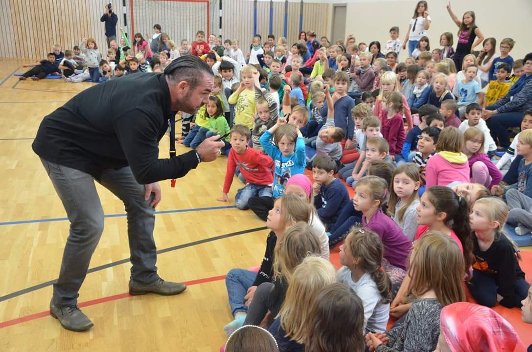 Carsten Stahl hat an vier Tagen intensiv mit den 5. Klassen zum Thema „Antimobbing“ und „Antigewalt“ gearbeitet. Eine Großveranstaltung in der Sporthalle der Friedensgrundschule mit den 4. und 6. Klassen folgte. Dazu kamen auch viele Gäste.